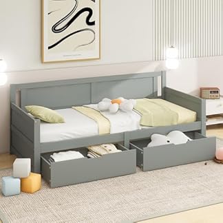 Kinderbett 90×200, Holzbett mit 2 Schubladen, Bett mit Lattenrost und Stauraum, Schlafsofa Tagesbett Sofabett Einzelbett Gästebett Jugendbett, Funktionsbett, Bettgestell aus Holz, ohne Matratze, Grau