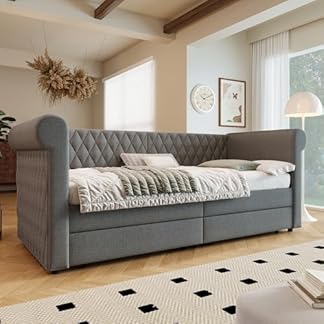958,75 €Produkt kaufenVintage Kopfteil Polsterbett, Sofabett, Tagesbett mit 2 Stauraum Schubladen, Bettgestell mit Lattenrost aus Holz(Ohne Matratze), Linen, 90×200 cm,Grau