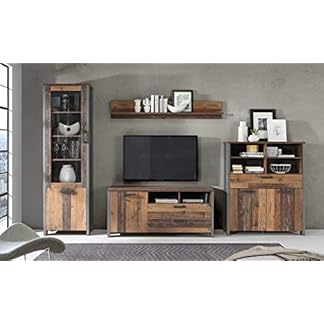 Forte Clif Wohnwand mit 5 Türen, 1 Glastür und 4 Schubladen, Holzwerkstoff, Old – Wood Vintage und Betonoptik Dunkelgrau, 330,4 x 204,7 x 52,3 cm