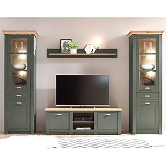 1493,02 €Produkt kaufenLomadox Wohnzimmer Wohnwand im Landhausstil, grün mit Wotan Eiche, mit Beleuchtung, 2 Standdvitrinen, TV-Lowboard und Wandregal, B/H/T: 308/207/45cm