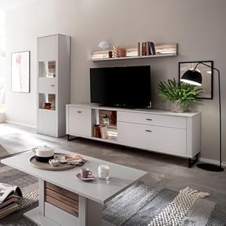1855,89 €Produkt kaufenLomadox Wohnwand Wohnmöbel Set weiß mit Eiche-Lamellen Modern, 1 Vitrine, 1 Wandboard, 1 Lowboard