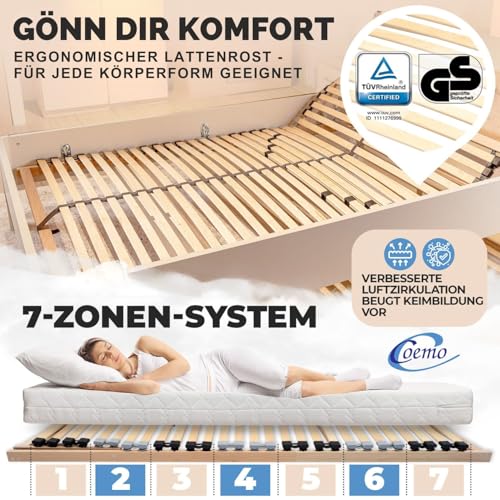 BESONDERS INDIVIDUELL EINSTELLBAR: Durch die 7 unterschiedlichen Zonen kann der Bettrost ganz gezielt auf Ihren Körper eingestellt werden. Der Komfort im Schulter- und Beckenbereich wird deutlich erhöht und die Wirkung der Matratze wird verbessert