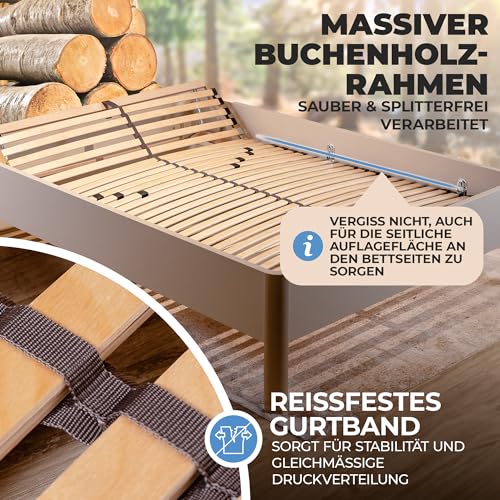 HÄRTEGRAD EINSTELLBAR: Die 5-fache Härtegradeinstellung ermöglicht eine individuelle Einstellung auf Ihren Körper. Die 28 Latten aus Birke und Buche sind durch Duokappen geräuschlos und fest am Rahmen montiert