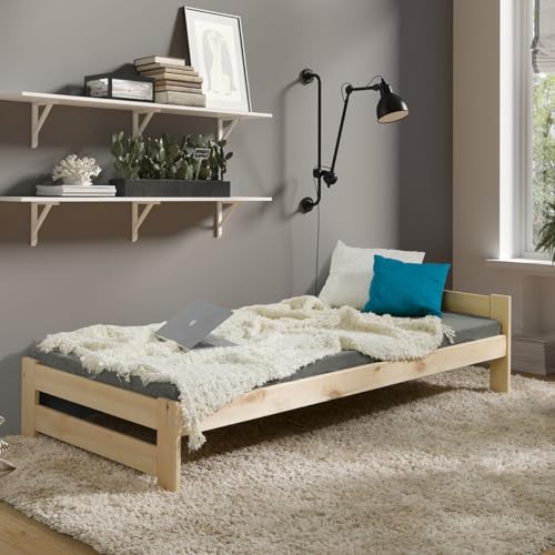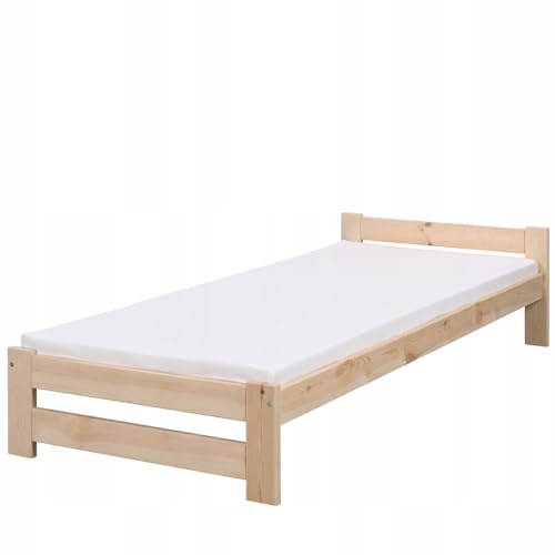 Dieses Bett aus massivem Kiefernholz kombiniert natürlichen Charme mit praktischer Funktionalität. Die unbehandelte Oberfläche bietet Ihnen die Möglichkeit, das Bett nach Ihren Wünschen zu aufführen oder es in seiner natürlichen Schönheit zu genießen. Dank des minimalistischen Designs fügt es sich sowohl in moderne als auch in klassische Schlafzimmer mühelos ein. Der einfache Aufbau ermöglicht eine schnelle Montage, während der Lattenrost mit 12 Erledigen für optimalen Schlafkomfort sorgt. Zudem sorgt die gute Luftzirkulation unter der Matratze für ein hygienisches und angenehmes Schlafklima – ein rundum durchdachtes Möbelstück für Ihr Schlafzimmer!