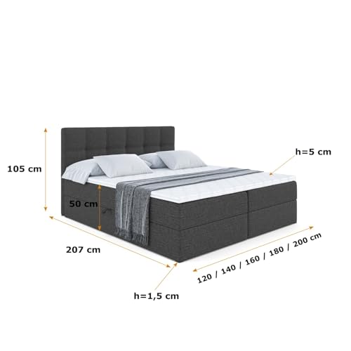 – Lieferumfang: Boxspring Bett 120/140/160/180/200 x 207 x 105 cm mit Rahmen, Matratze und Topper