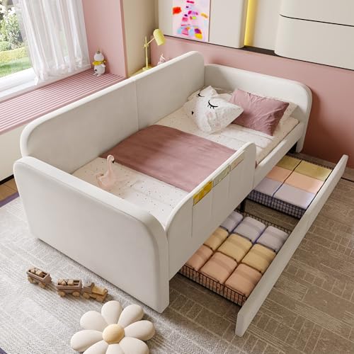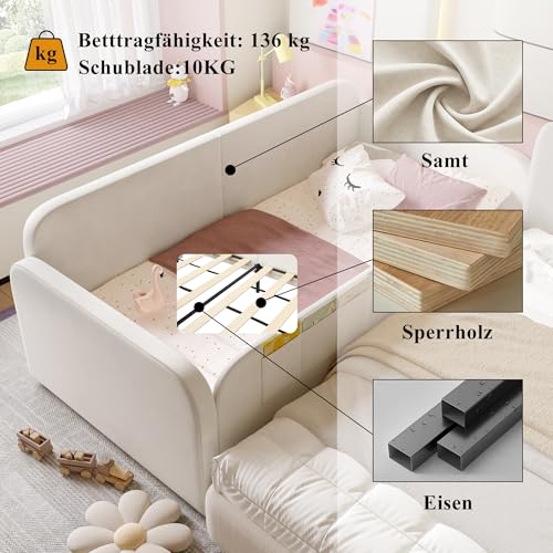 Abundant Stauraum: Dieses Bett ist mit zwei Schubladen mit Rollen ausgestattet, die sich mühelos herausziehen und herausschieben lassen und zur Aufbewahrung von Weckern, Spielzeug, Kleidung und anderen Dingen des täglichen Bedarfs verwendet werden können. Die Bettseitenteile verfügen über drei kleine Taschen für zusätzlichen Stauraum.