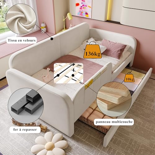 Der Stoff dieses gepolsterten Einzelbetts ist jeglicher kuscheligem Samt, der sich weich anfühlt, und die Seitenteile rund um das Bett sind erhöht, um die Sicherheit zu erhöhen.Dieses Bett kann allein verwendet oder als Kinderbett an ein Elternbett angeschlossen werden. Innovative Funktionalität und zeitgemäßes Design verbinden sich zu einem Schlafzimmermöbel, das Stil, Komfort und praktischen Stauraum in sich vereint.