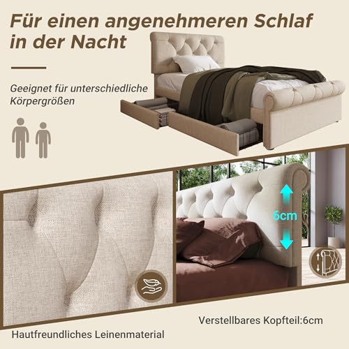 Chesterfield Design mit verstellbarem Kopfteil Das klassische Scroll-Design mit Knopfstich-Detail und höhenverstellbarem Kopfteil (6 cm Teilbereich) verleiht dem Bett elegante Wohnraum-Ästhetik.
