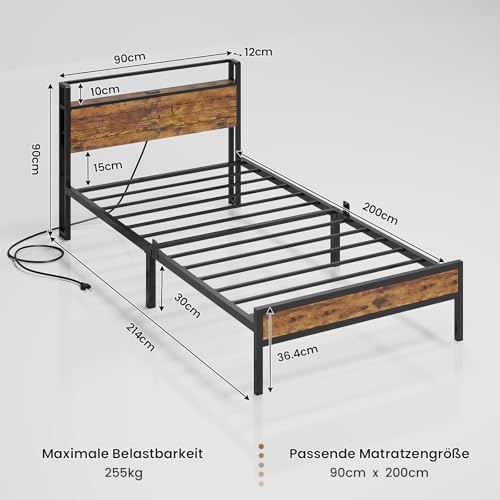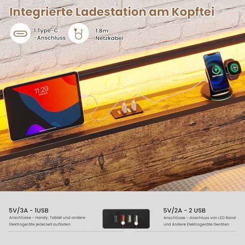 【Kopfteil mit LED und USB-Anschlüssen】Das Metallbett ist mit einer RGB LED-Beleuchtung ausgestattet. Per Schalter oder APP können die Farben und Helligkeit der Lichtleiste je nach Ihrem Wunsch eingestellt werden, um eine warme und verträumte Atmosphäre in Ihrem Schlafzimmer zu bestellen. Mit 3 USB-Anschlüssen am Kopfteil können Sie Ihr Handy, Tablet, Mac oder andere elektronische Geräte noch bequem aufladen