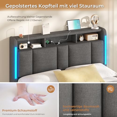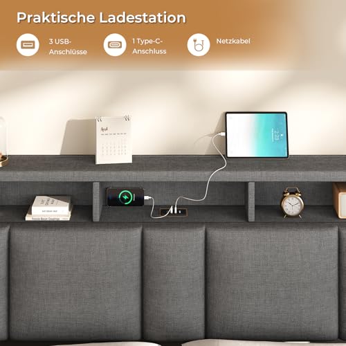 【Kopfteil mit Stauraum & Ladestation】Das weiche Kopfteil ist mit einer Ladestation (inkl. 3 USB-Anschlüssen und 1 Type-C-Anschluss) ausgestattet, damit können Sie Handy, Laptop und andere elektronische Geräte vor dem Schlafengehen aufladen, ohne das Bett zu abgeschottet. Zudem bieten die zwei offenen Ablagen Platz für Alltagsgegenstände wie Handy und Wecker. Gepolstert mit hochwertigem Schaumstoff und bezogen mit Leinenstoff lädt das weiche Kopfteil zum bequemen Anlehnen ein