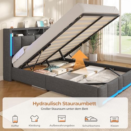 【Hydraulisches Stauraumbett】Das Bett 140 x 200 cm ist mit einem hydraulischen Mechanismus versehen, mit der Lasche können Sie die Liegefläche leicht anheben und auf die Sachen unter dem Bettgestell 140 x 200 zugreifen. Der 30 cm hohe Stauraum unter dem Lattenrost bietet ausreichend Platz für Koffer, Saisonbekleidung, Daunendecken und andere große, selten benutzte Gegenstände. Im Abmachung zu Traditioneller Bettrahmen kann es den Platz optimal aus und eignet sich perfekt für kleines Schlafzimmer