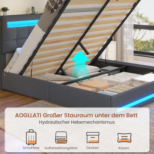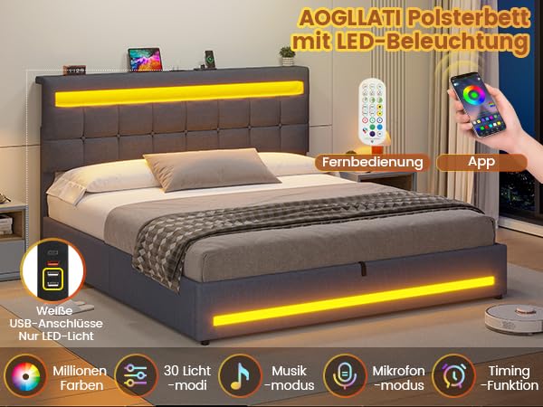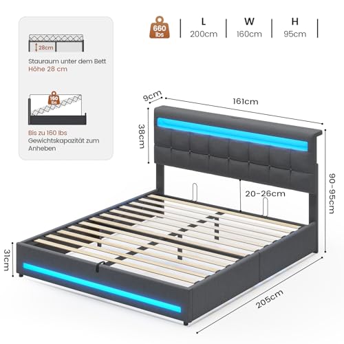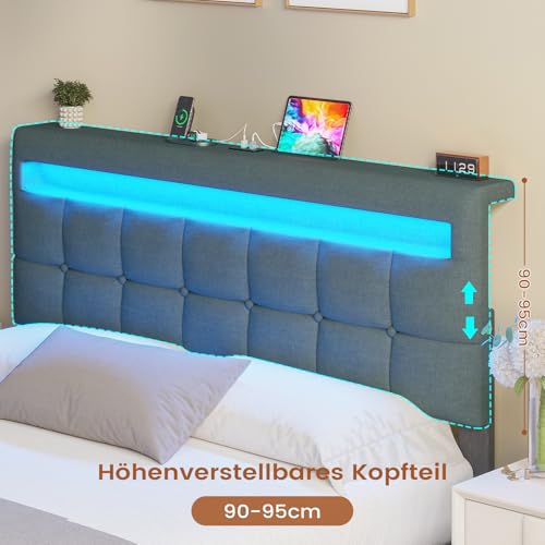 【Multifunktionale LED-Beleuchtung】Das Polsterbett 160×200 ist am Kopf- und Fußende mit LED-Lichtleisten entworfen. Die Farbe, Helligkeit ,Musikmodus, Timing-Aufnahme etc. können Sie per APP oder Fernbedienung vom Bett aus einstellen. Der dunkelgraue Bettrahmen mit LED-Lichtleiste verleiht Ihrem Schlafzimmer einen futuristischen Hauch und schafft eine gewünschte Atmosphäre im Zimmer