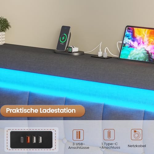 【Höhenverstellbares Kopfteil】Das Kopfteil lässt sich um 5 cm nach oben und hinunter verstellt werden, und die Höhe kann nach Belieben aufeinander abgestimmt werden, was für Menschen aller Aufziehen und Größen praktisch ist. Das breite Kopfteil fügt Weichheit und Komfort hinzu, perfekt zum Anlehnen.Das Kopfteil von diesem Bettgestell ist mit einer Ladestation ausgestattet. Mit 3 USB-Anschlüssen und 1 Type-C-Anschluss können Sie Handy, Tablet, Kopfhörer und andere elektronische Geräte bequem mit Strom einspeisen