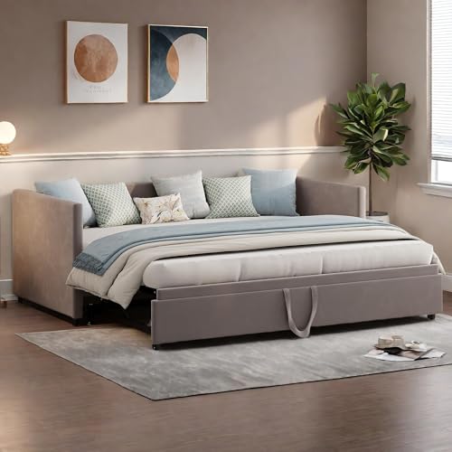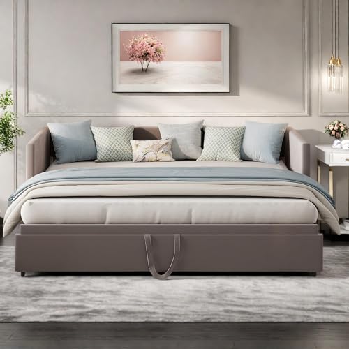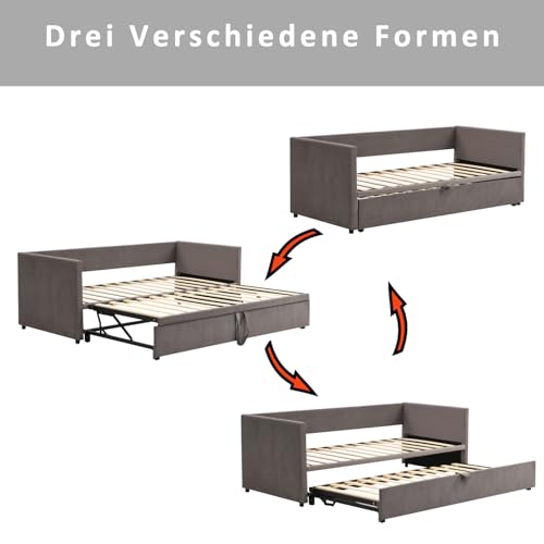 Einziehbares Bettgestell:An der Unterseite dieses Holzbettrahmens befindet sich ein zweiter einziehbarer Bettrahmen. Die beiden Bettrahmen lassen sich zu einer Größe von 180×200 cm generalisieren und können problemlos ein Einzel- oder Doppelbett bilden. Ultimatives 2-in-1 umwandelbares Schlafsofa, dient als Entspannungsplatz im Wohnzimmer oder als Zusatzbett für Gäste