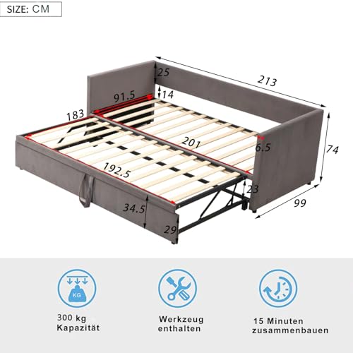 2.Dieses gepolsterte Schlafsofa verfügt über einen robusten Lattenrost mit einer soliden Konstruktion, die für Stabilität und eine Belastbarkeit des Bettes von bis zu 300 kg sorgt. Egal, ob Sie es als Sofa oder als Bett verwenden, es wird Ihnen zuverlässige Leistung und lang anhaltenden Komfort bieten.