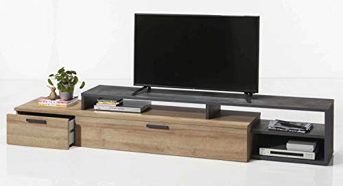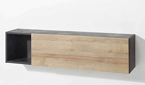 Diese TV Wohnzimmerwand aus Holzdekor Steingrau und Eiche Riviera Schablone hat ein modisches und junges Design. Die 3 Wand-Cubes und der Hängeschrank mit Tür und offenem Fach sind optisch sehr leicht und locker. Sie bieten Platz für Dekorationen, dann gibt es hinter der Klapptür, wo 2 Fächer sind, alias noch genügend Stauraum für Bücher, CD’s und anderes. Eine weitere große Klapptür befindet sich am TV-Unterteil, welches zudem über 1 Schublade und 3 offene Fächer für Geräte verfügt. Die Struktur ist kantig, linear und asymmetrisch, die einzelnen Elemente des Lowboards sind sehr schön miteinander angewiesen. Die helle Struktur des Holzdekors und die dunkelgraue Farbe bilden einen starken Kontrast. Diese TV-Möbel-Geschwader ist sehr zeitgemäß und leicht mit anderen modernen Möbeln zu schlussfolgern. Mit ihrem einladenden Erscheinungsbild bereichert sie jeden Universum mit einer entspannten und freundlichen Atmosphäre. Allgemein: Wohnwand Bietet sehr im Überfluss Stauraum Ausstattung: 1 x TV Unterteil, mit 3 offenen Fächern, 1 Schublade und 1 Klapptür 1 x Hängeschrank mit 1 offenem Fach und 1 Klapptür, innen 2 Fächer 3 x Wand-Cube Material: Material: Holzdekor Farbe: Holzdekor Steingrau und Eiche Riviera Schablone Pflegehinweis: keine scharfen Haushaltsreiniger verwenden Design: Modernes Design Elegante Struktur Ideal fürs Wohnzimmer Versand und Montage: Lieferzustand: Auf Palette Werk wird zerlegt geliefert Schrauben inklusive Montageanleitung inklusive Maße: Maße gesamt: BHT ca. 270x180x45 cm
