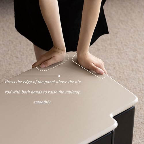 Drücken Sie mit beiden Händen auf die Kante der Platte über dem Luftstab, um die Tischplatte sanft anzuheben. Da sich in der Box eine Gasfeder befindet, hebt sich die Platte beim Drücken. Setzen Sie sich nicht auf den Couchtisch.