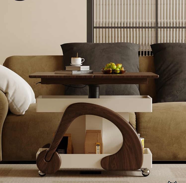 An der Unterseite ist ein 6 kg schweres Gegengewicht jeder Eisen versteckt, um das Gleichgewicht und die Stabilität zu gewährleisten. Die Bogenecken sind an den Seiten versenkt und bilden Armlehnen, die das Schieben und Ziehen des Couchtisches mit einer Hand mildern.