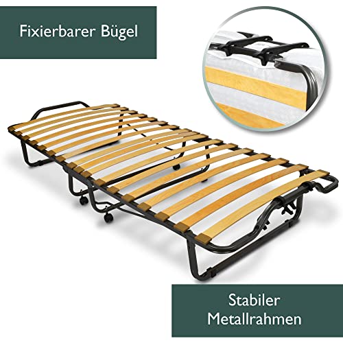 𝗦𝗧𝗔𝗕𝗜𝗟𝗘𝗥 𝗦𝗧𝗔𝗛𝗟𝗥𝗔𝗛𝗠𝗘𝗡 – Mit dem stabilen Metallrahmen kann das bequeme Gästebett ein Gewicht von bis zu 100 kg tragen. Außerdem ist der Rahmen für mehr Komfort und Stabilität mit Holzlatten verstärkt. Das faltbare Notbett wiegt ca. 21 kg und hat zusammengeklappt eine Größe von 80 x 35 x 113 cm.