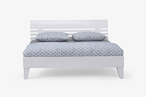 Das Massivholzbett besticht durch seine solide, massive und andererseits moderne Optik und die klaren Linien. Die Standfüße ermöglichen üppig Bodenfreiheit. Die Farbe in Buche weiß lackiert rundet das Erscheinungsbild ab. Das Kopfteil ist ein Hingucker. Durch seine höhenverstellbare Längstraverse kann die Einlegtiefe 4-fach versellt und Rahmen und Matratze optimal abgestimmt werden. Das Bett ist aka für den Einsatz eines Motorrahmens sinnvoll. Bei der Vielfältigkeit an verschiedenen Größen, wird für ziemlich jeden Raum die passende Größe geboten.