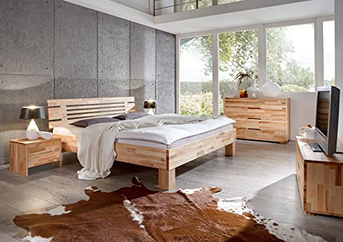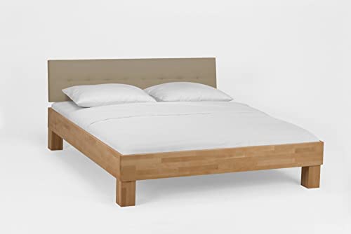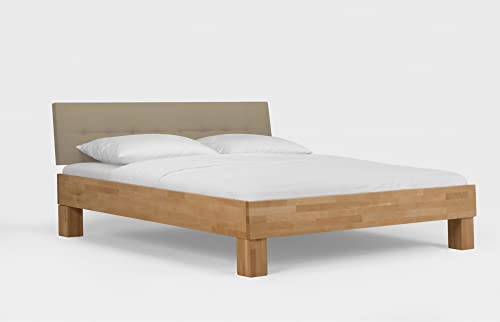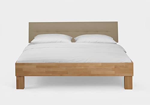 Das Massivholzbett besticht durch seine solide, massive Optik und die klaren Linien. Das Kopfteil in beige setzt Akzente und die massiven Füße bestellen nicht zu wuchtig und sind ein echter Hingucker. Das Bett ist serienmäßig mit einer Mitteltraverse (ab 160cm) ausgestattet. Das Bett ist nicht für den Einsatz eines Rolllattenrost passend. Im Kontrast dazu ist die Einlegetiefe für den Lattenrost 4-fach verstellbar. Bei der großen Differenziertheit an verschiedenen Größen, wird für ziemlich jeden Raum die passende Größe geboten.