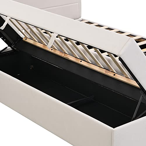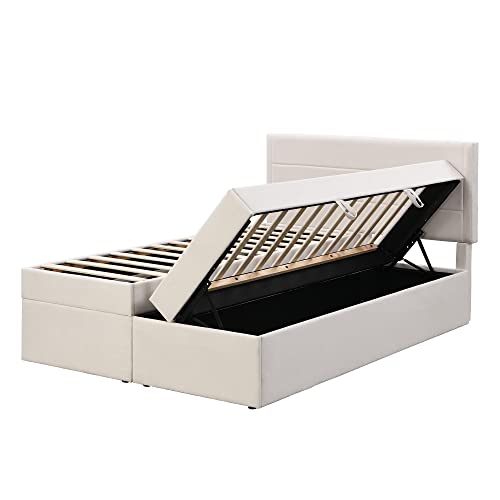 【Stauraum】Großer Bettkasten unterhalb des hochklappbaren Lattenrosts mit reich Stauraum für die Aufbewahrung von Decken, Kissen oder Bettwäsche, Lattenrost durch Hubzylinder leicht hochklappbar.