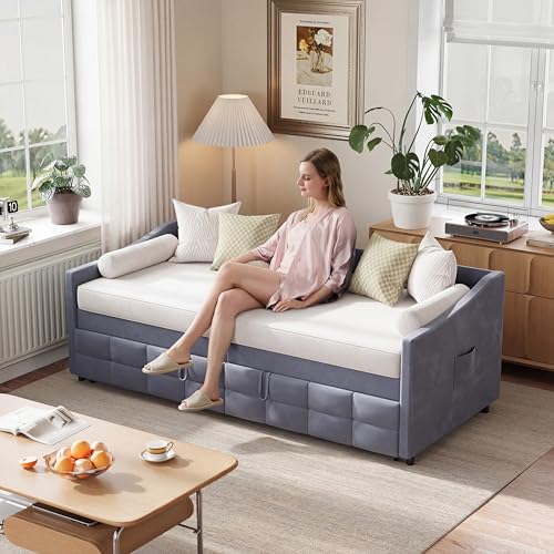 Stabile Stabilität und Langlebigkeit: Dieses vielseitige ausziehbare Schlafsofa verfügt über einen verstärkten Metallrahmen und hochwertige Holzlatten zur Unterstützung. Diese robuste Kombination sorgt für außergewöhnliche Haltbarkeit und Sicherheit und bietet eine stabile und zuverlässige Oberfläche, egal ob Sie auf dem Sofa absitzen oder im Bett schlafen. Dieses Schlafsofa ist auf Langlebigkeit ausgelegt und gibt Ihnen ein sicheres Stimmungslage.