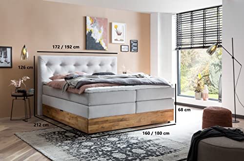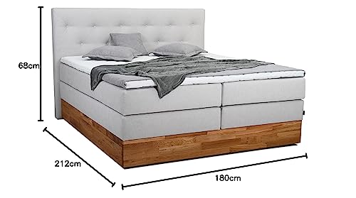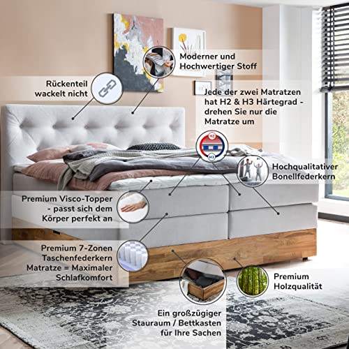 ⚫ TECHNISCHE DATEN: Dimension: 180×200 cm (Breite x Länge) – Härtegrad: H2 und H3 ✔Jede Matratze hat eine Seite H2 und die andere H3. Zugegeben kann sich jede Person, abgekoppelt von der anderen Seite, Ihre gewünschte Härte votieren – Material: 100% Luxus Stoff – Außenholz: 100 % Eiche – Bonellfederkern + Taschenfederkernmatratze (7-Zonen) + Visco Topper mit Memoryeffekt + Bettkasten