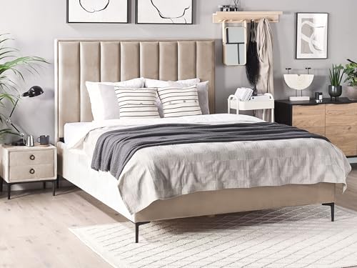 Luxuriöses, taupefarbenes Samtbett mit passenden Nachtschränken.