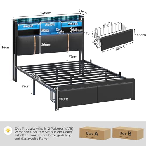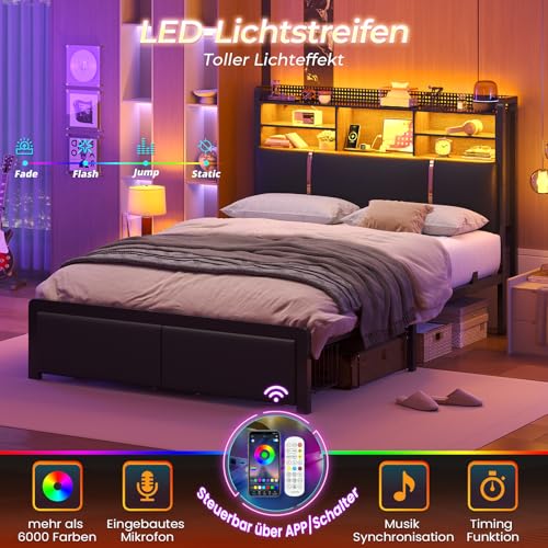 Multifunktionale LED-Lichtleiste: Das Kopfteil verfügt über eine LED-Lichtleiste, die über eine Fernbedienung oder eine App gesteuert werden kann, um Farbe, Helligkeit, Musikmodus und Timer-Einstellungen anzupassen. Im Musikmodus mergen sich Lichtfarben und Blinkrhythmen mit dem Beat und verwandeln das beleuchtete Bett von einer Nachtbeleuchtung in einen Stimmungsmacher