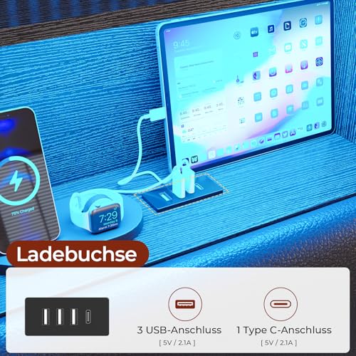 Multifunktionales Kopfteil: Das ganz schwarzem PU-Stoff gefertigte Kopfteil besticht durch sein elegantes, raffiniertes Aussehen, das sich mühelos pflegen lässt – wischen Sie die Oberfläche einfach ab. Auf der oberen Ablagekasten finden Uhren, Mobiltelefone und Dekorationsartikel Platz. Die integrierte Steckdosenleiste verfügt über drei USB-Anschlüsse und einen Typ-C-Anschluss zum bequemen Aufladen von Telefonen, Tablets und anderen Geräten. Die gepolsterte Oberfläche bietet weichen, bequemen Halt zum Anlehnen