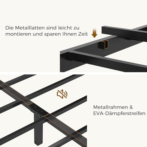 Solide & Stabil: Das Bettgestell verfügt über einen sicheren und strapazierfähigen Lattenrost aus Metall, der für mehr Stabilität sorgt. Im Vergleich zu Holzlatten bieten die Metalllatten ausgezeichnete Stütze und eine lange Lebensdauer. Auch die EVA-Dämpferstreifen auf den Latten vermeiden die Reibungsgeräusche, sodass Sie eine ruhige Nacht voller erholsamen Schlaf genießen können. Die 4 Matratzenhalter aus Plastik können frei positioniert werden, um ein Verrutschen der Matratze zu vermeiden