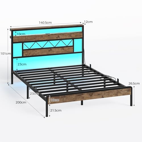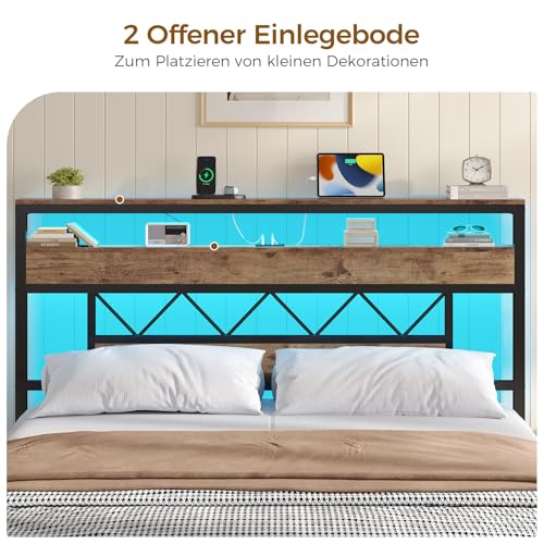 Bett 140X200 mit LED-Beleuchtung, Bettgestell 140×200 Lattenrost aus Metall, Metallbett mit Steckdose, Holzkopfteil mit 2 Offener Einlegebode, Stauraum unter dem Bett, Schlafzimmer, Vintage-Braun