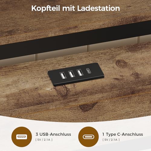 LED-Beleuchtung & Ladeanschlüsse: Das Kopfteil ist mit einer LED-Lichtleiste ausgestattet. Per App oder Fernbedienung lassen sich die Farben, Helligkeit, Timing-Funktion und der Musikmodus einstellen. Im Musikmodus verändert sich die Lichtfarbe mit der Musik. So bietet das Bett mit LED nicht nur nächtliche Beleuchtung, sondern schafft auch verschiedene Stimmungen. Mit 3 USB-Anschlüssen und 1 Type-C-Ladebuchse am Kopfteil können Sie Handy, Tablet und andere elektrische Geräte bequem aufladen