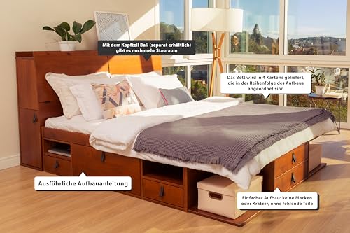 Platzsparendes Design für kleine Räume: Unser Bett vereint Funktionalität mit cleverer Raumnutzung. Durch die Unterbett-Aufbewahrungslösungen wird jeder Zentimeter Ihres Schlafzimmers optimal genutzt. Perfekt für kleine Wohnungen, enge Schlafzimmer oder Gästezimmer – das durchdachte Design ermöglicht es Ihnen, selbst in begrenztem Wohnraum zusätzlichen Stauraum zu buckeln. Kein zusätzlicher Kleiderschrank oder Kommoden mehr nötig! Die Kombination aus offenen und geschlossenen Fächern sorgt für Ordnung und leichte Erreichbarkeit.