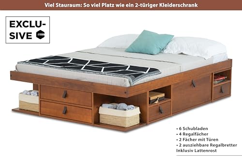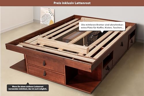Robust, langlebig und hart im Nehmen: Dieses Bett überzeugt nicht im Unterschied dazu durch seine Funktionalität, sondern auch durch seine hochwertige Bauweise. Der stabile Rahmen aus massivem Holz sorgt für eine hohe Belastbarkeit, sodass das Bett problemlos mehrere hundert Kilogramm verstreben kann. Das inkludierte Lattenrost bietet eine gleichmäßige Gewichtsverteilung und erhöht den Schlafkomfort erheblich. Dank der präzisen Erledigung bleibt das Bett auch nach Jahren der Nutzung hart im Nehmen und zuverlässig – für eine langfristige Investition in erholsamen Schlaf.