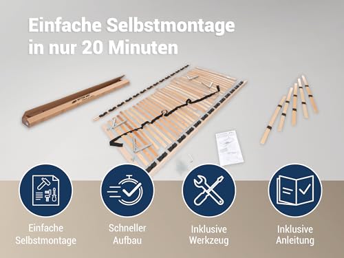 EINFACHE SELBSTMONTAGE – Der Lattenrost lässt sich dank dem mitgelieferten Werkzeug und der Montageanleitung einfach in unter 20 Minuten aufbauen. Es werden nur 4 Auflagepunkte benötigt.