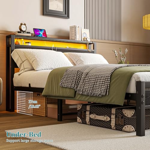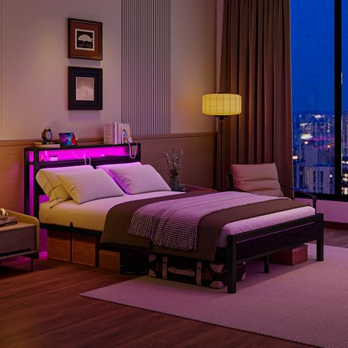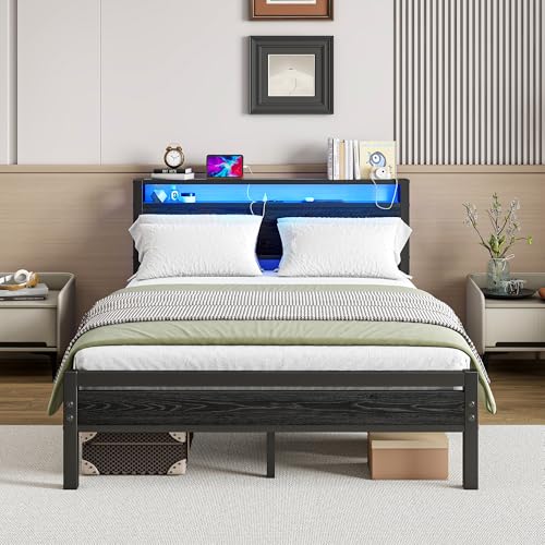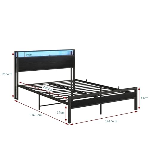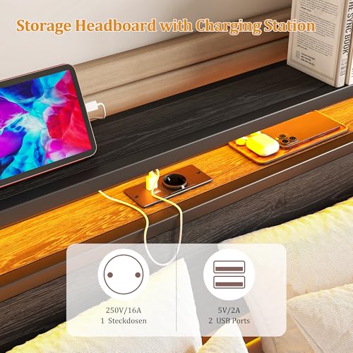 BORPHOM Metallbett aufgebraucht Metall,140×200 Bettgestell mit Lattenrost mit USB Typ C Ladefunktion,Bettrahmen Holz mit Stauraum Kopfteil,Doppelbett Stauraumbett Gästebett Jugendbett 140×200,Schwarz