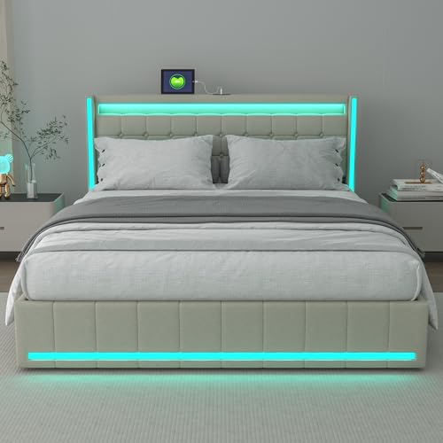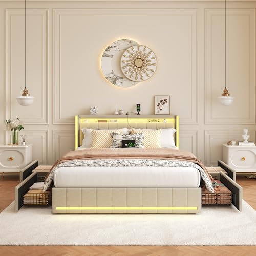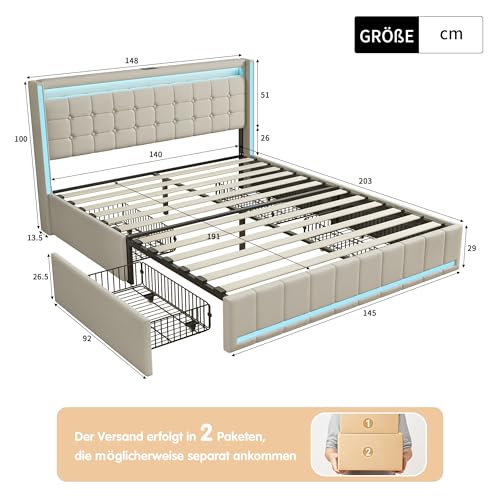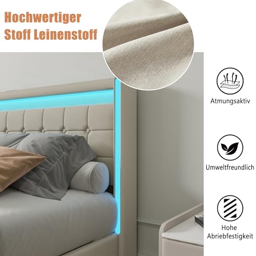BHFFTHK Polsterbett 140×190 mit LED, Doppelbett mit Stauraum 4 Schubladen und Lattenrost, Kopfteil mit USB Ladefunktion, Stauraumbetten Funktionsbetten Bettgestell, Leinen Beige, Ohne Matratze