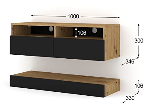 Maße (Breite x Hölle x Höhe) Hängender TV-Schrank – 100 x 34,6 x 30 cm; Bodenplatte – 100 x 33 x 10,6 cm; Hängeschrank – 35 x 34,6 x 120 cm