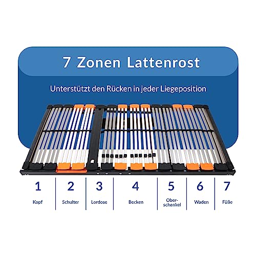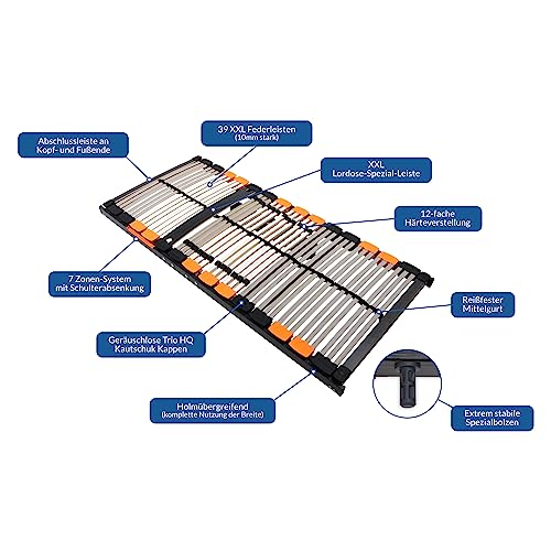 XXL 7-ZONEN LATTENROST – Der BMM Lattenrahmen kann in ein Bettgestell, Gästebett oder Klappbett eingelegt werden. Sinnvoll ist er statt allesamt Matratzen. Geliefert wird er gesamt fertig montiert.
