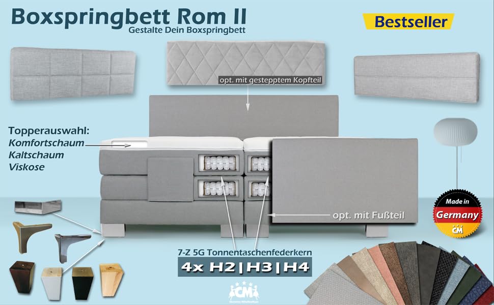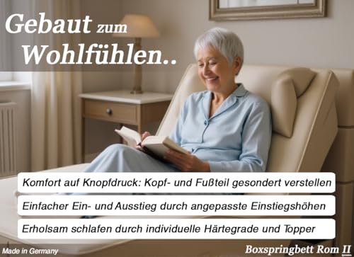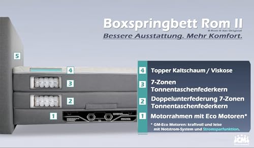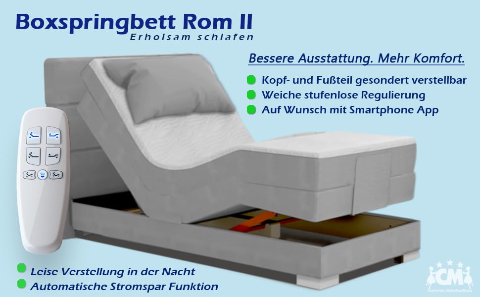 Das beliebte Boxspringbett ROM II elektrisch verstellbar mit Doppelunterfederung und Topper. Ausgesuchte Materialien. Manufaktur Design. Handarbeit Made in Germany. Die Farbauswahl und Härtegrde werden telefonisch nach der Bestellung aufgenommen. Alle Auswahlmöglichkeiten (Farbe / Matratzen / Topper) sind im Preis inbegriffen.