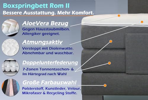 Das beliebte Boxspringbett ROM II elektrisch verstellbar mit Doppelunterfederung und Topper. Ausgesuchte Materialien. Manufaktur Design. Handarbeit Made in Germany. Die Farbauswahl und Härtegrde werden telefonisch nach der Anbau aufgenommen. Jeder Auswahlmöglichkeiten (Farbe / Matratzen / Topper) sind im Aufschlag inbegriffen.