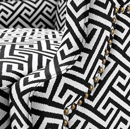 Material: Kiefernholz, Eisen, Schaum, StoffBreite: 74 cmTiefe: 70 cmHöhe: 118 cmSitztiefe: 60 cmSitzhöhe: 45 cmHöhe der Armlehne: 63 cmFarbe: schwarz – weiß Vorschlag / schwarze Beine / antiquarisch messing NägelStoffzusammensetzung: 100% Polyester Ballast: 27 kgExzellente Verarbeitung