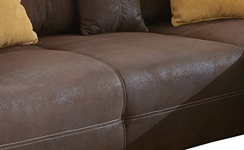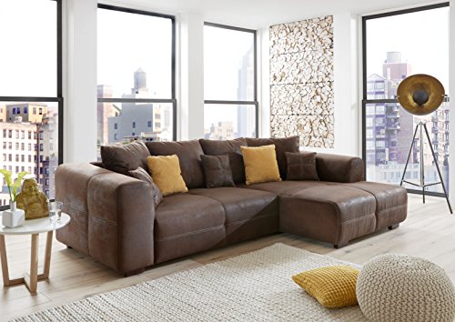 Cavadore Ecksofa Mavericco / Polster Eck-Couch mit Kissen in Antik-Leder-Optik und Holzfüßen / Longchair rechts / 285 x 69 x 170 / Mikrofaser Braun
