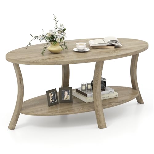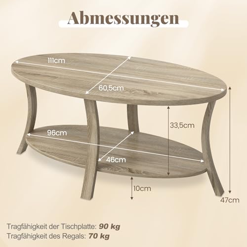Mit einem praktischen 2-stöckigen Design bietet dieser ovale Couchtisch massenhaft Stauraum. Alldem ungeachtet besteht dieser Wohnzimmertisch jedweder Gummibaumholz und gespreizten Beinen und bietet eine große Belastbarkeit von bis zu 160 kg. Sein charmanter rustikaler Bauernhaus-Look verleiht verschiedenen Räumen zeitlose Eleganz. Dieser vielseitige Tisch fügt sich nahtlos in Wohnzimmer, Schlafzimmer, Arbeitszimmer, Empfangsbereiche und mehr ein.
