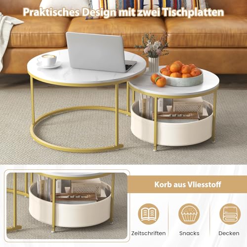 【Herausragender Organizer】Mit 2 Tischplatten bietet das Beistelltisch-Set viel Platz, um Kaffee und Snacks während der Entspannung abzustellen. Zusätzlich eignet sich der abnehmbare Stoff-Aufbewahrungskorb ideal zur Ordnung von Zeitschriften, Spielzeug oder Decken.