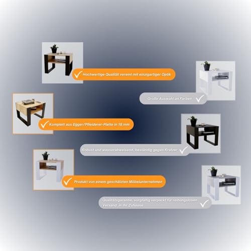 VERARBEITUNG: Die Kanten sind via einer 0,8 mm starken Antiblockiersystem-Kante von Egger versehen, die eine perfekte Passform via der Platte garantiert. MAßE: Tischangaben Höhe: 45cm, Breite: 65cm, Abgrund: 53,6 cm. Regal Höhe: 16cm, Breite der Beine: 10cm