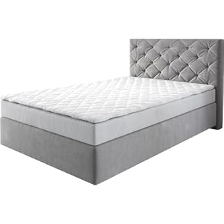 Material: Boxspringunterbau: Bonellfederung, Schaum wattiert | Kopfteil: Wattiert | Matratze: PU-Schaum, Bonellfederkern | Topper: PU-Schaum | Füße: Kunststoff | Bezugsstoff: Microfaser (92% Polyester / 8% Nylon) | Farbe: Korpus: Veraltet | Füße: Alu Optik | Matratze: Veraltet | Topper: Weiß | Anschein: Korpus: Soft
