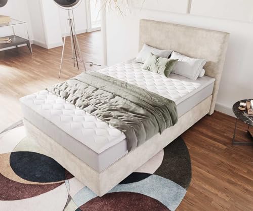 Neben dem eleganten Design überzeugt das Dream Boxspringbett vor allem durch seinen besonderen Schlafkomfort. Die hochwertige TFK Matratze passt sich perfekt aus Körperform an und unterstützt durch miteinander verbundenen, hingegen frei beweglichen Federn schonend Rücken und Becken für einen erholsamen Schlaf ohne störendes Nachschwingen der Matratze. Ausgestattet mit durchdachten Hohlräumen im Kerninnern bietet die hochentwickelte Matratze eine allerbest hohe Atmungsaktivität durch bewegungssynchrone Belüftung. Die Taschenfederkernmatratze ist mit zwei Härtegraden, H2 & H3 ausgestattet. Durch einfaches wenden der Matratze kann der Härtegrad gewählt werden der dir besser zuspricht.Neben der hochwertigen Matratze verfügt das Dream Boxspringbett über einen pflegeleichten Viscotopper, der für ein wolkiges und noch erholsameres Schlaferlebnis. Er verfügt über eine geniale Memory Schaum Lichtbild und unterstützend effektiv den gesamten Bewegungsapparat, um entspannt zur Ruhe zu kommen und erholsamen Schlaf zu finden. Das Bett Dream-Well stilvoller Look für unterschiedliche EinrichtungenMit dem Boxspringbett erhälst du einen Satz mitgelieferter Füße in eleganter Alu Optik. Diese kannst du nach Belieben sichtbar im vorderen Unvollendetes oder versetzt nach achtern montieren, um eine schwebende Optik des Bettes zu erreichen. Die Boxspringbetten sind bekannt als ohne Matratze erhältlich und können mit anderen Matratzen versehen werden. So kannst du dir das Bett zusammenstellen von dem Du immerdar geträumt hast. Der samtweiche Cordstoff mit seiner chrakteristisch gerippten Oberfläche erscheint in beruhigendem Beige. Produktmaße:Maße ca.: B120 x T200 x H112 cmMaße Füße ca.: BB5 x T5 x H6 cmMaße der Matratze ca.: B120x T200x H17 cmMaße Boxspringunterbau ca.: B120x T200x H31 cmMaße vom Kopfteil ca.: B124x T10x H112 cmLiegefläche ca.: 120×200 cmLiegehöhe mit Füßen: 60cmMaße Topper ca.: B120x T200x H6 cmProduktmaterial:Boxspringunterbau: BonellfederungKopfteil: Wattiert